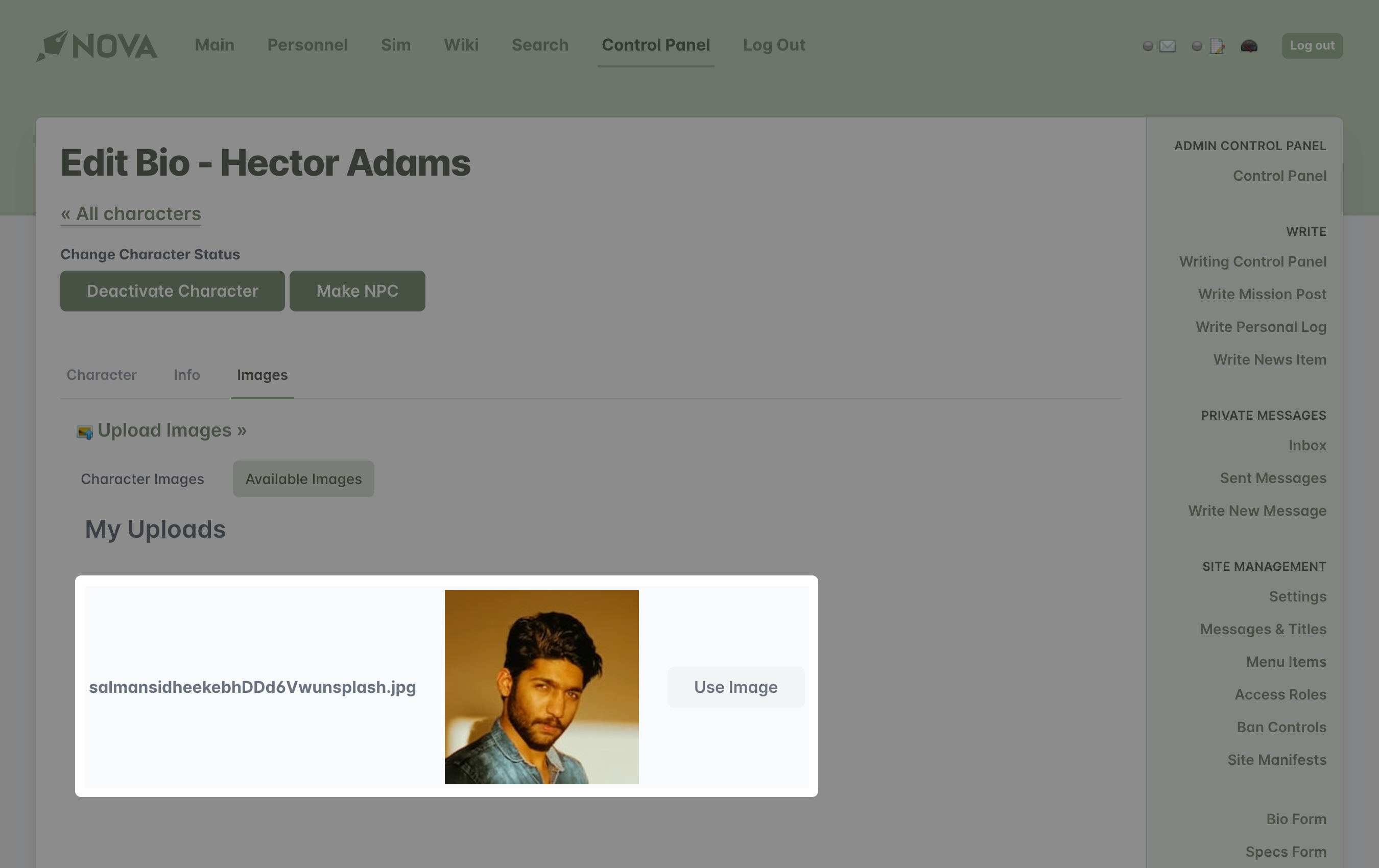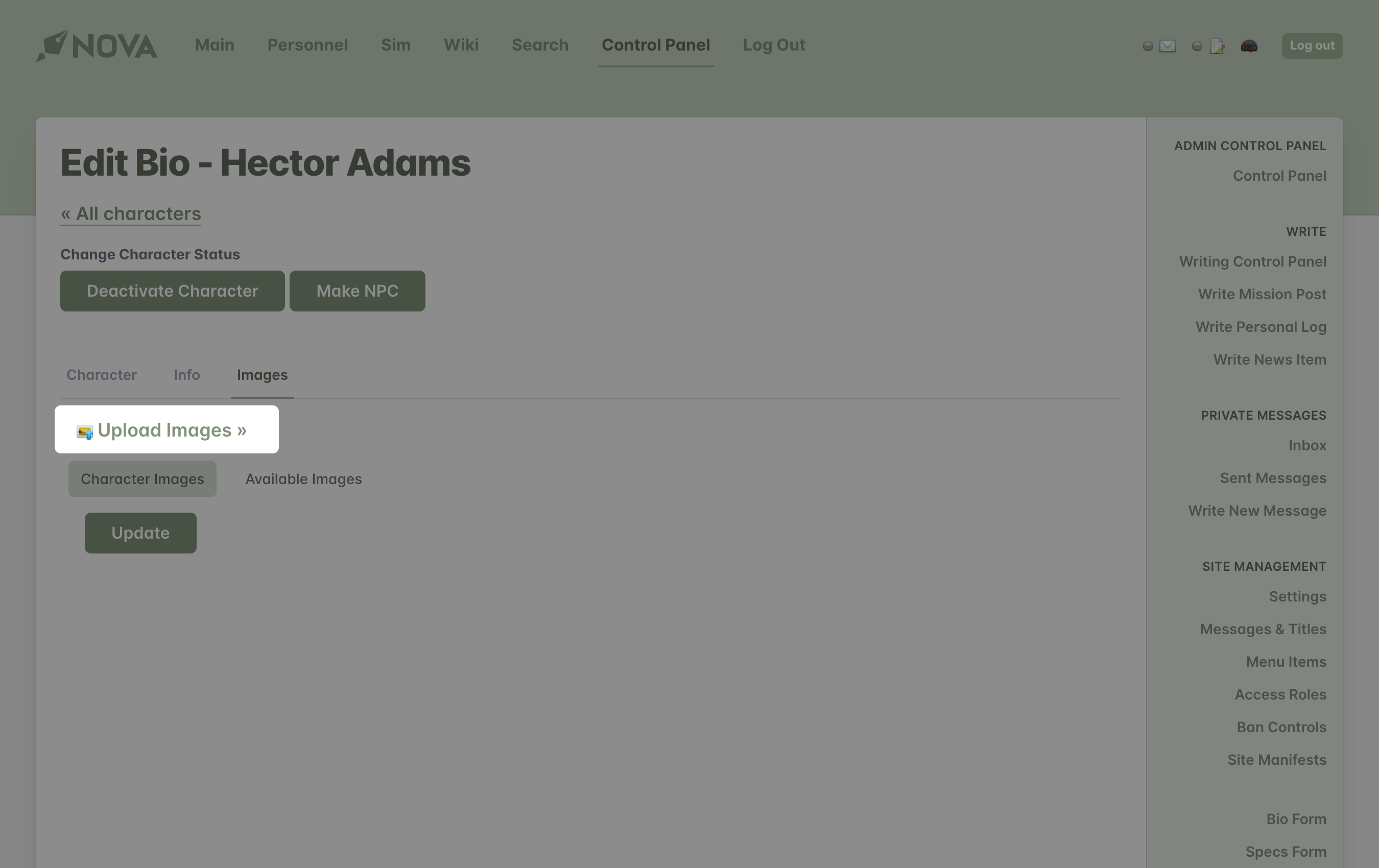 As your time on the game progresses, you may desire to edit your character’s bio in order to keep it up to date. To do so, you can access your bio via the game’s Personnel page. If you are logged in, you will see a link on your bio to edit your character. Alternatively, you can access any of your character bios from the Dashboard. Simply click the Dashboard icon at the top of the page. Make any adjustments to your bio and click submit at the bottom of the page. You can also add image(s) to your character, such as an avatar to give the other players a better idea of what your character looks like.Adding a secondary character