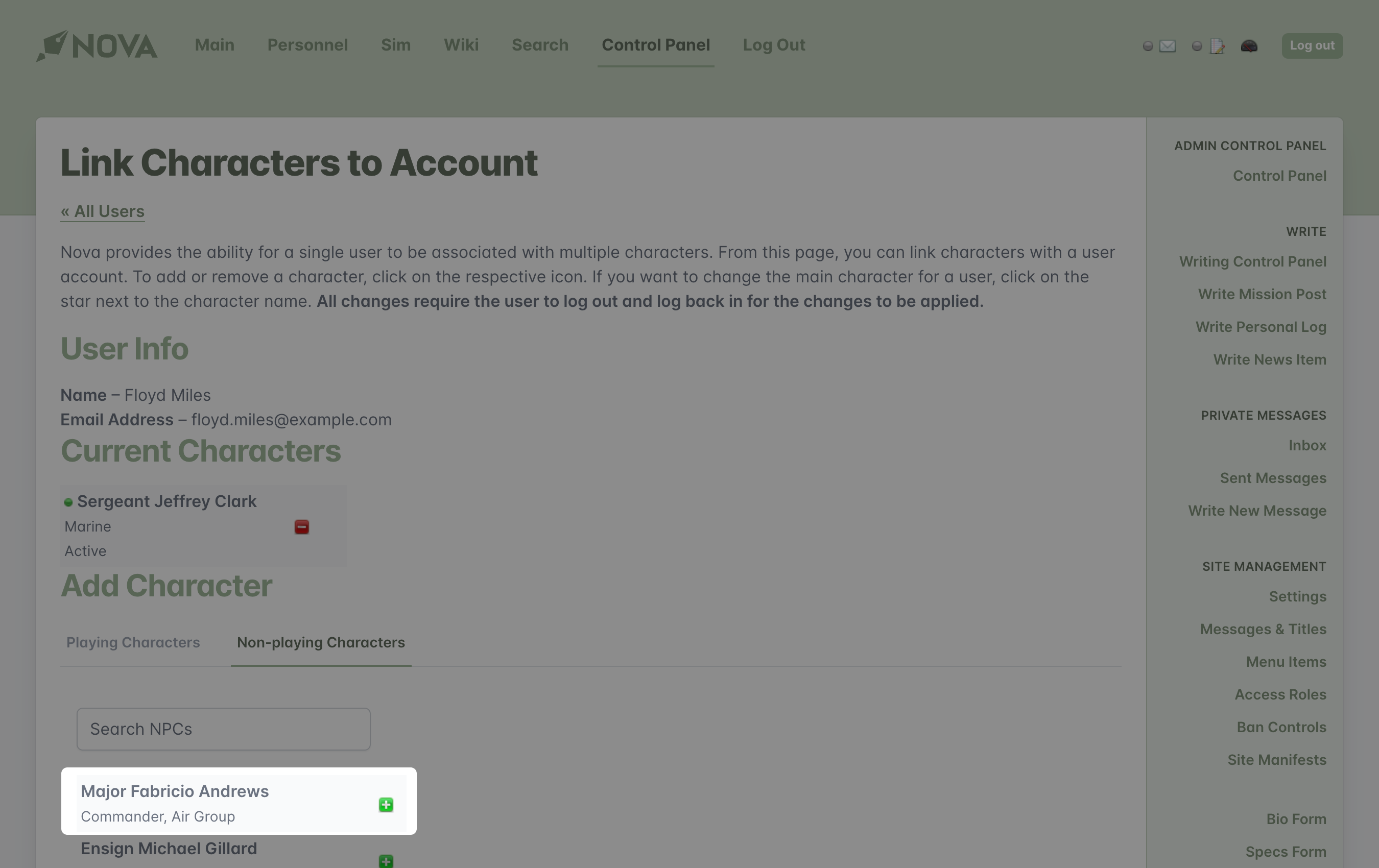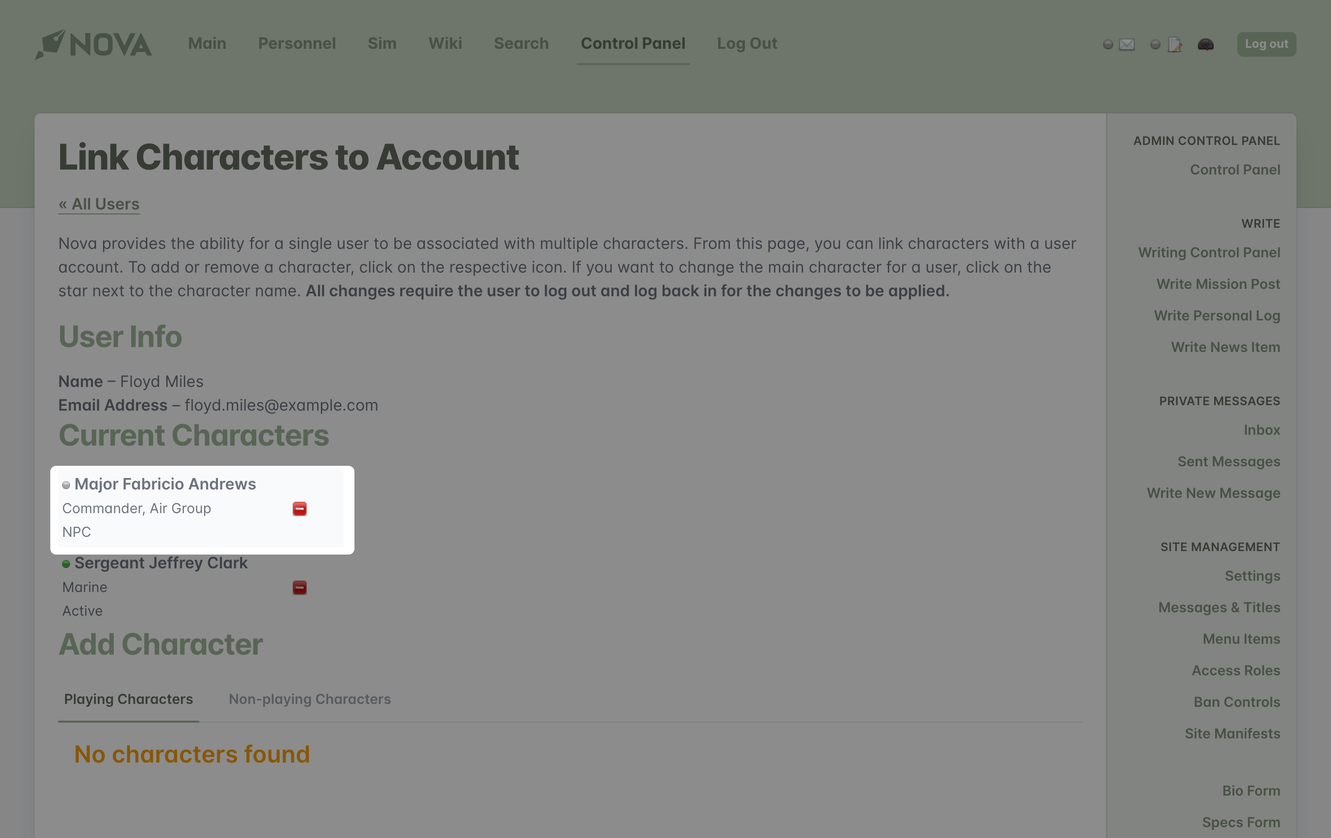 To assign a secondary character to a user, you must have at least the Basic Administration access role, or your access role needs to have NPC Management Level 2 or 3 feature(s) enabled. Typically, this feature is reserved for those who are managing the game.If you do not have this access, you will have to contact a member of the game’s management to have the secondary character assigned to you.