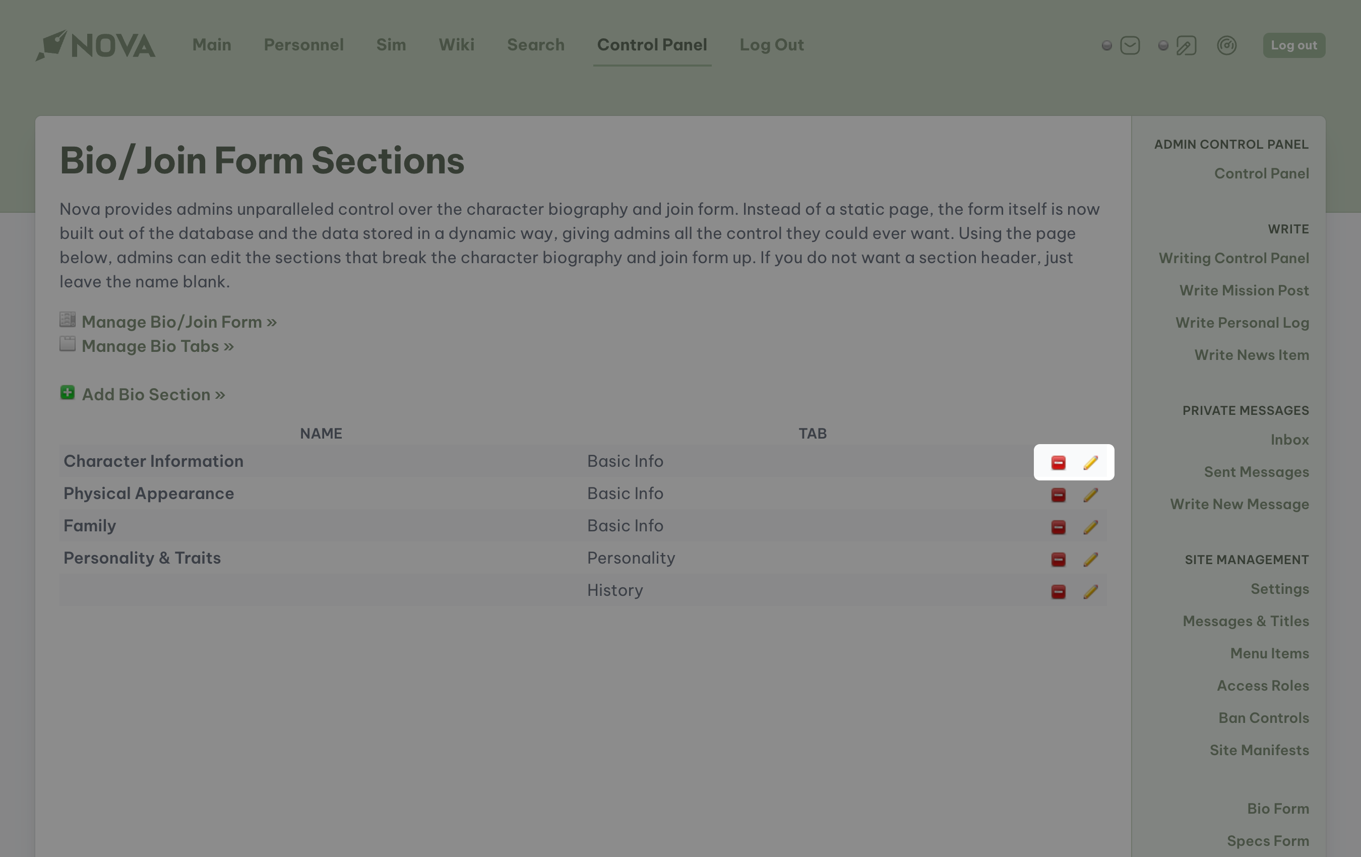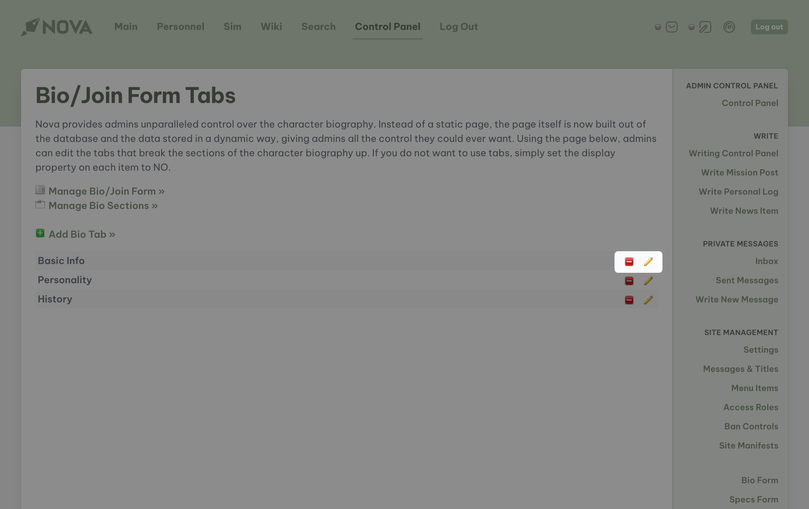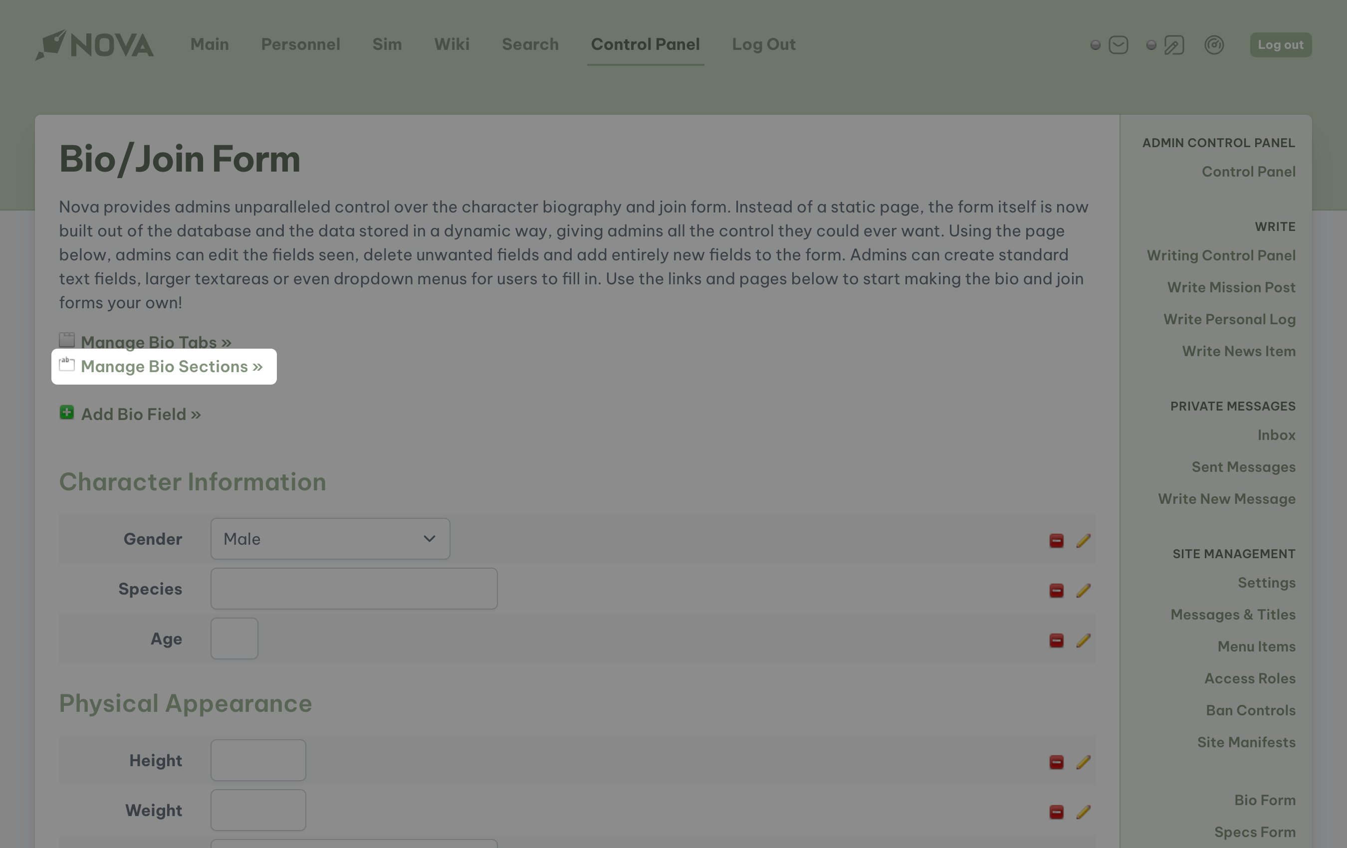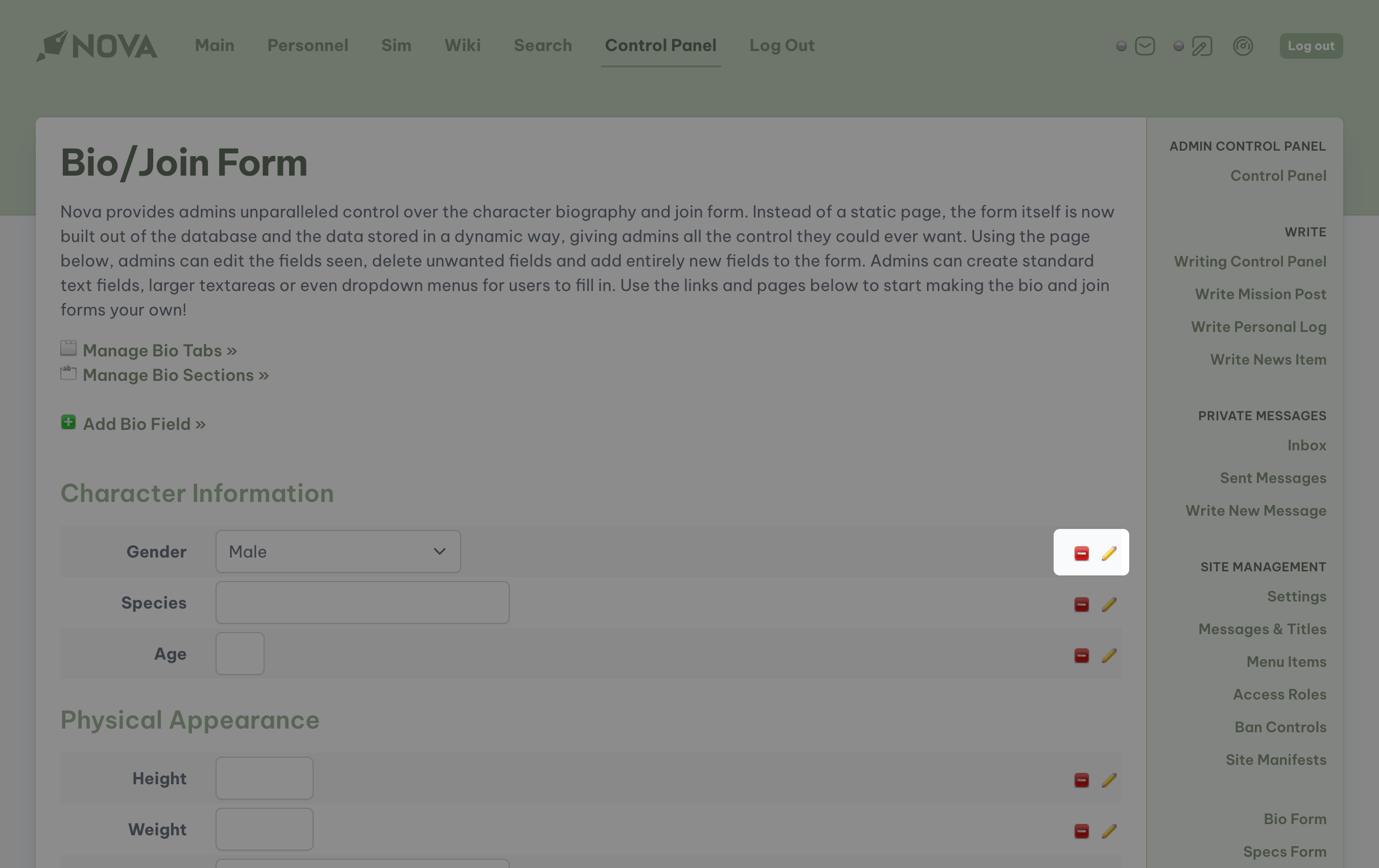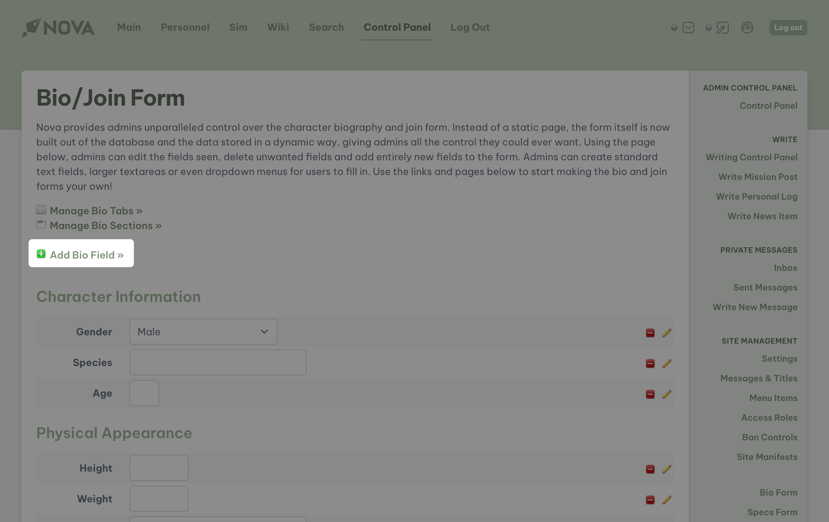 To edit any form in Nova, you must have at least the System Administration access role, or your access role needs to have the appropriate form management (such as Bio/Join Form, Specs Form, etc.) feature(s) enabled. Typically, this feature is reserved for those who are managing the game. If you wish to learn how to submit a new character to a game, please review the characters guide.Creating and editing fields