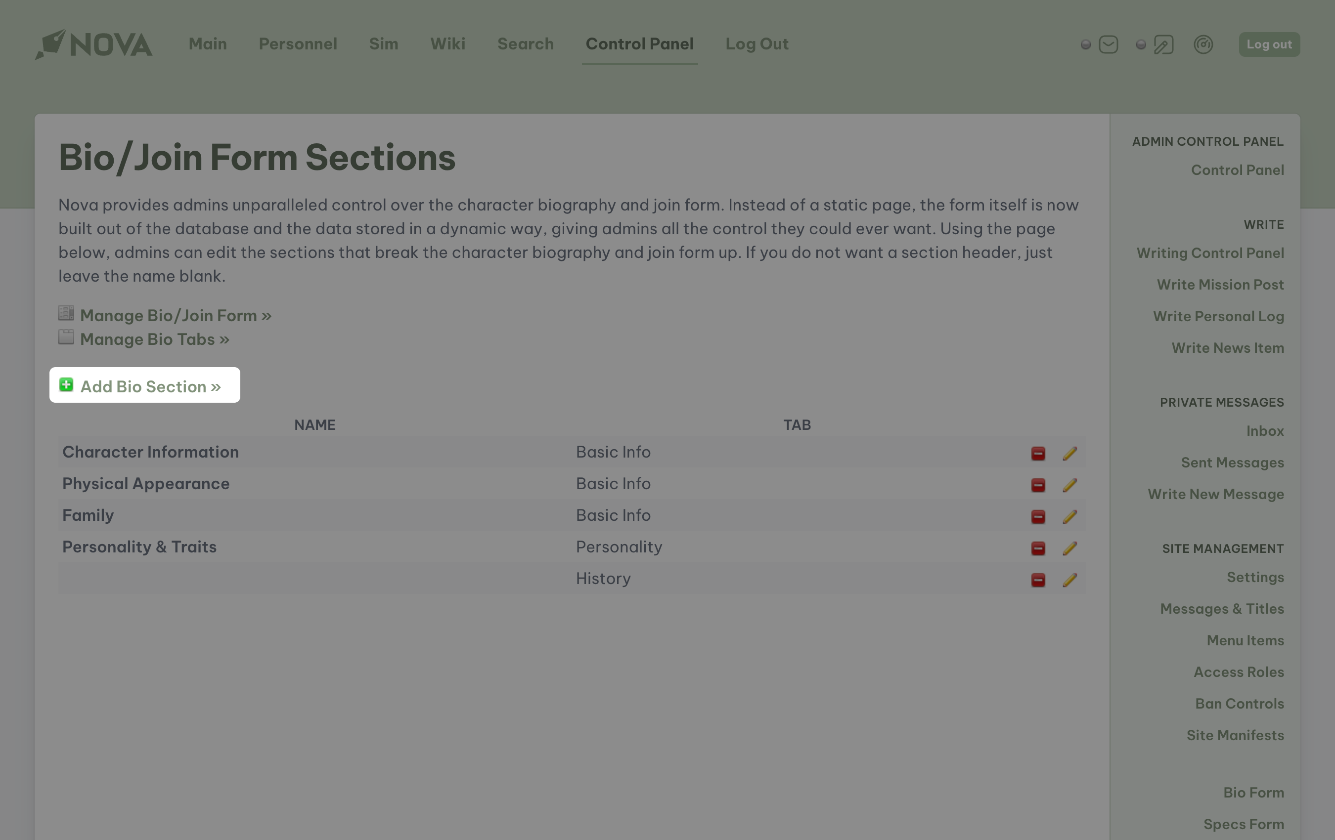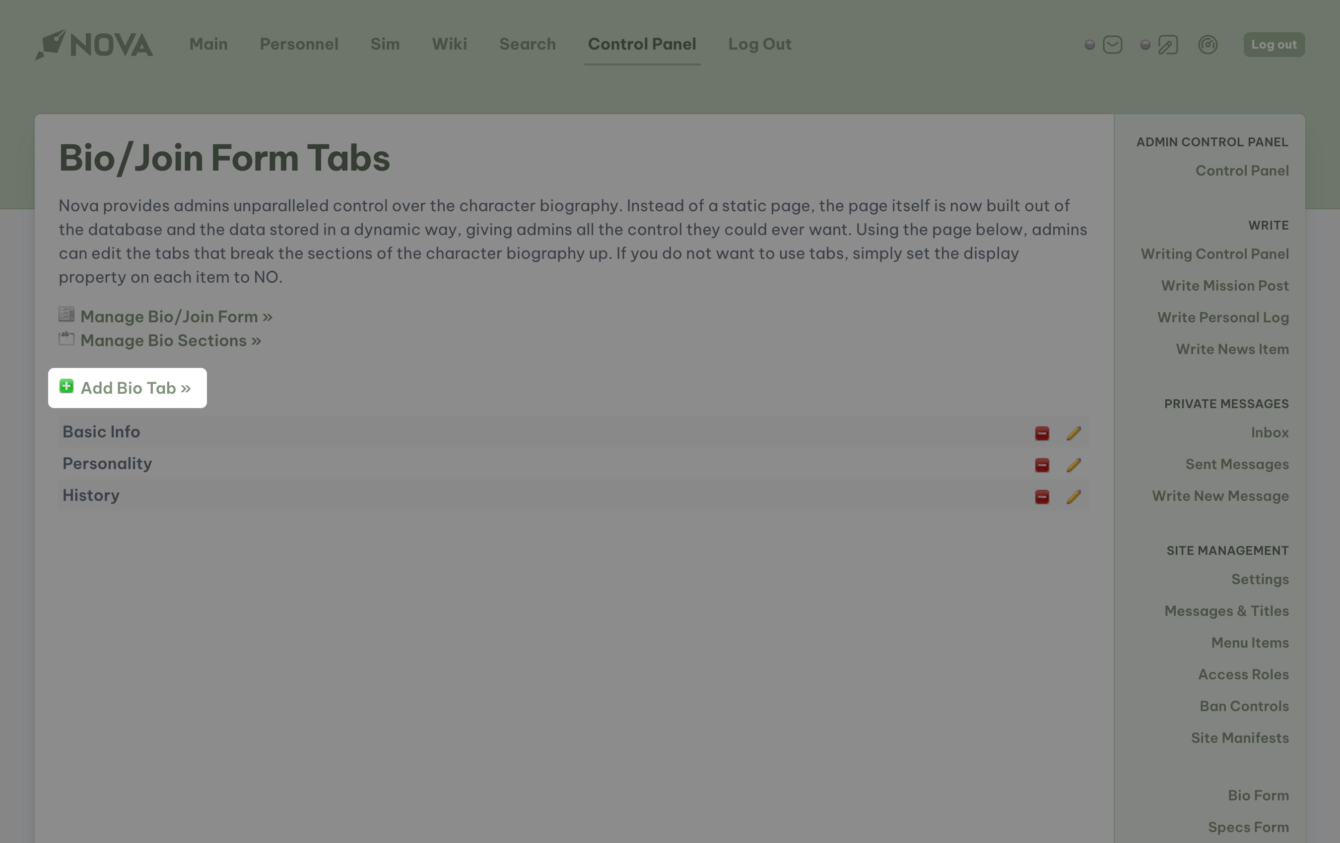 The Bio form utilizes tabs that allow players to move to particular sections of a character’s bio. This is extremely helpful as many quality bios can be quite lengthy, or perhaps the management team would prefer quicker access to certain information. To manage this section, access the Bio Form page through Nova’s control panel and click on Manage Bio Tabs.